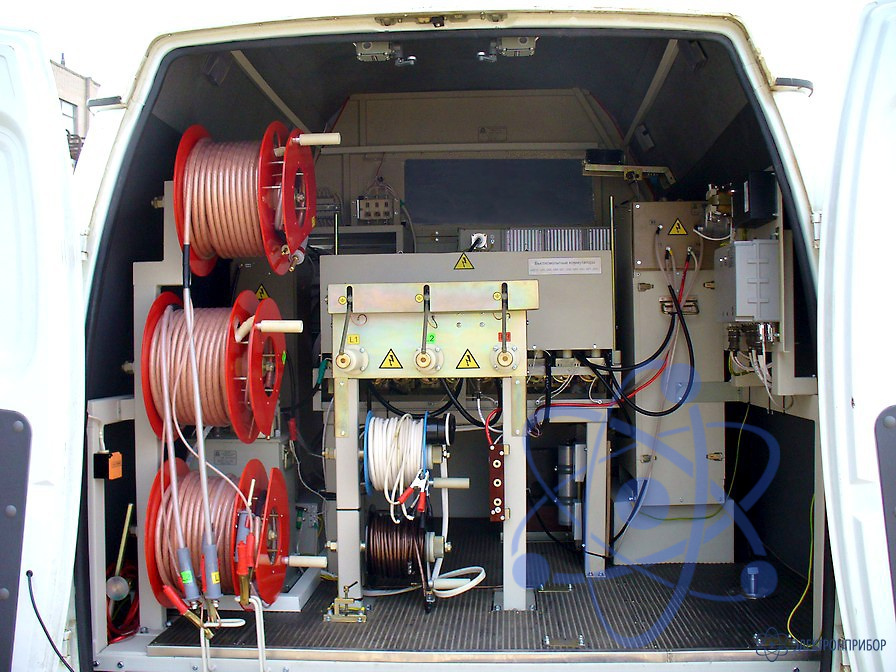 Внешние подключения лаборатории обеспечиваются барабаном с кабелем питания, барабаном с кабелем заземления и тремя барабанами с высоковольтными кабелями. Длина кабелей на барабанах 30 м. По желанию заказчика длина кабелей может быть увеличена: