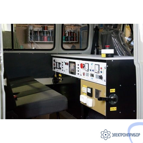 Пульт управления в пассажирском (операторском) отсеке с размещением блоков управления в корпусах евростандарта 19 дюймов. Система осуществляет контроль безопасности, управления испытаниями и переключения высоковольтных модулей электролаборатории.