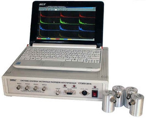 На экране компьютера отображается временная и спектральная формы сигналов с акустических датчиков (параллельно по четырем каналам), с указанием всех основных параметров сигналов и их спектров.