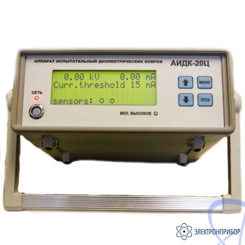 Установка проверки диэлектрических ковров АИДК-20Ц предназначена для проверки неа электрическую прочность диэлектрических ковров, осуществляет генерирование напряжения переменного тока синусоидальной формы частоты 50 Гц, измерение напряжения и силы перменного тока частотой 50 Гц при проведении электрических испытаний диэлектрических ковров по ГОСТ 4997-75 Метод 1.