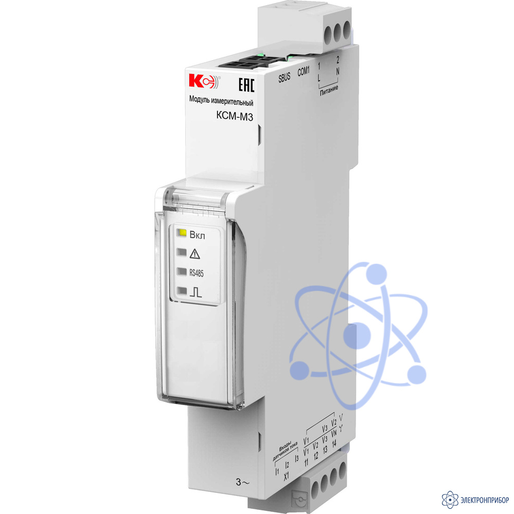 Имеет 3 дискретных входа и соединяется с модулем измерительным КСМ-МЗ с помощью цифрового интерфейса RS-485 (SBUS) с протоколом связи Modbus-RTU.
