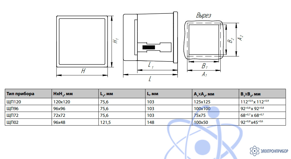 Приборы выпускаются в виде нескольких модификаций: ЩП120, ЩП96, ЩП72, ЩП02, отличающихся габаритными размерами. Информация об исполнении прибора (в зависимости от заказа) содержится в коде полного условного обозначения: