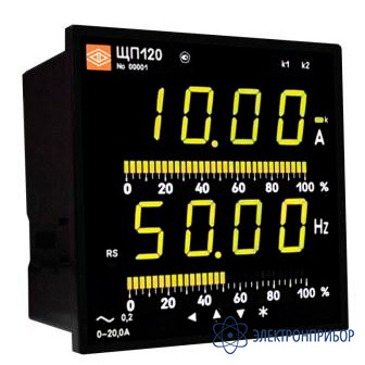 Прибор ЩП120, основной индикатор – диапазон измерений входного сигнала от 0 до 500 В, дополнительный индикатор – диапазон измерений частоты от 100 до 850 Гц, напряжение питания от 85 до 264 В переменного тока частотой 50 Гц или от 100 до 370 В постоянного тока, два интерфейса RS485, два аналоговых выхода 0…5 мА и 0…20 мА, два дискретных выхода, цветной комбинированный индикатор, класс точности 0,5, эксплуатация на АЭС, с двумя дополнительными барграфическими (дискретно-аналоговыми) шкалами