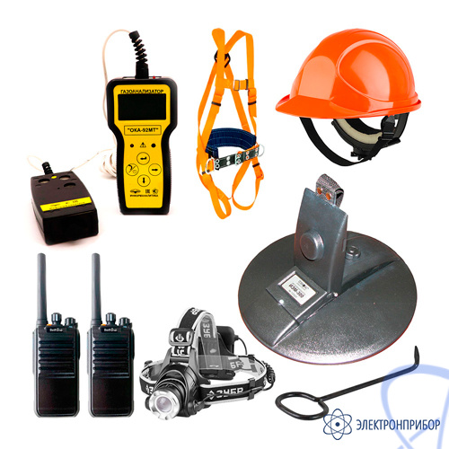 Комплект взрывозащищенного переносного газоанализатора для колодцев с люкоискателем, крюком для открывания люков канализационных колодцев, страховочным поясом, фонарем, защитной каской и взрывозащищёнными рациями.