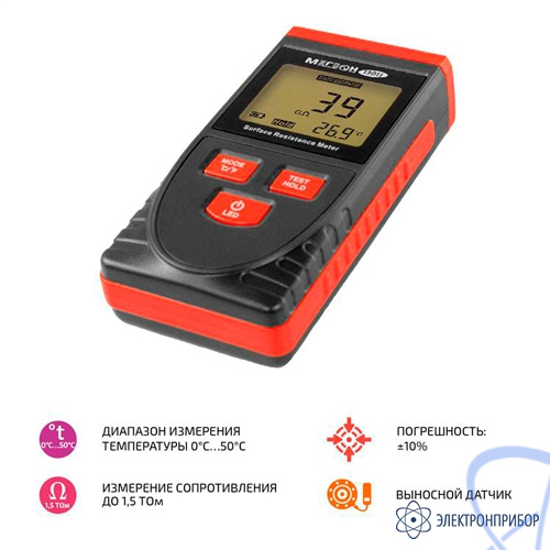 МЕГЕОН 13011 представляет собой переносной омметр для измерений сопротивления поверхностей из диэлектрических материалов - это сопротивление, проявляемое диэлектриком при протекании постоянного тока по его поверхности. Благодаря своей портативности, отлично подходит для работы в полевых условиях. Измеритель отличает отменная точность результатов и наглядность органов управления, то есть простота использования, а также хорошо читаемый дисплей с подсветкой. Также прибор имеет возможность замерять температуру. Дополнительно в комплекте поставки есть выносной щуп – для замеров в труднодоступных местах. Присутствует отображение последних измеренных показаний. Каждая операция занимает не более 1 секунды. Элементом питания выступает батарея девять вольт типа «Крона». Обладая подобным функционалом прибор послужит незаменимым инструментом инженера в выборе материалов.