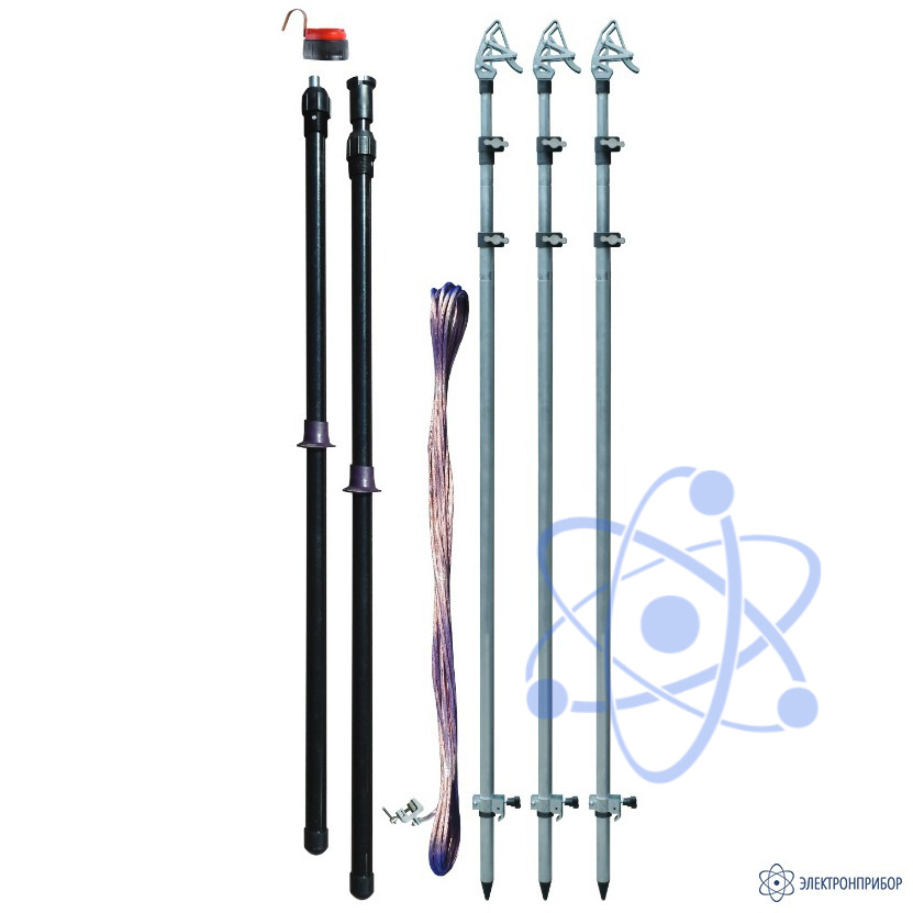 Заземление выполнено со штангами телескопической конструкции. Данная конструкция позволяет быстро подготавливать заземление к работе без лишних операций по соединению звеньев штанги и быстро выбирать удобную длину штанги для установки заземления. В комплект входит универсальный указатель высокого напряжения, который также поставляется на телескопической штанге.