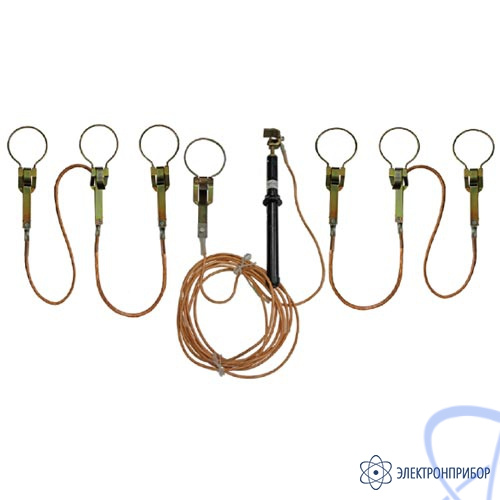 Заземляющая часть (2 на рис. 1) содержит один электродинамический зажим (3 на рис. 1), заземляющий провод (4 на рис. 1) и заземляющую струбцину (5 на рис. 1), снабженную стеклопластиковой штангой-рукояткой (6 на рис. 1).
