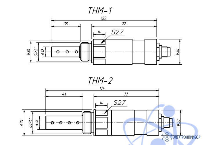 Габаритные и установочные размеры датчиков влагосодержания приведены на рисунке. Основное различие заключается в размере посадочной резьбы: ½’ для THM-1 и ¾’ для THM-2 и размерах отсека сенсоров.