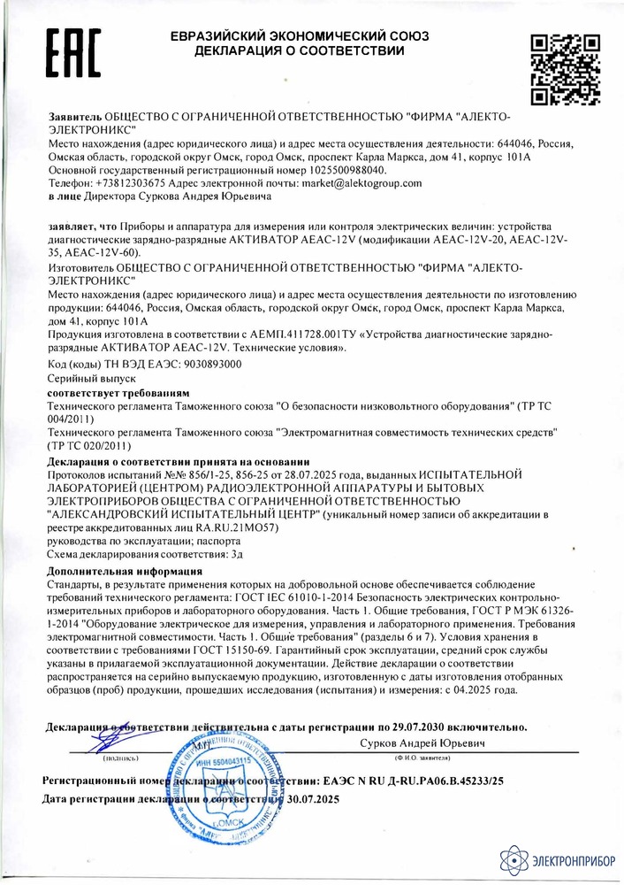 Документация для АЕАС-12V-35 — активатор аккумуляторных батарей