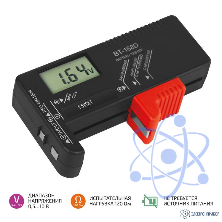 МЕГЕОН BT-168D это тестер, предназначенный для проверки батареек приборов, детских игрушек и многих других изделий бытового и промышленного назначения. Питание прибора осуществляется от проверяемого питателя, поэтому дополнительная батарея не потребуется. Сможет быстро определить остаточный заряд под нагрузкой 120 Ом большей части неперезаряжаемых батареек и аналогичных им аккумуляторов.