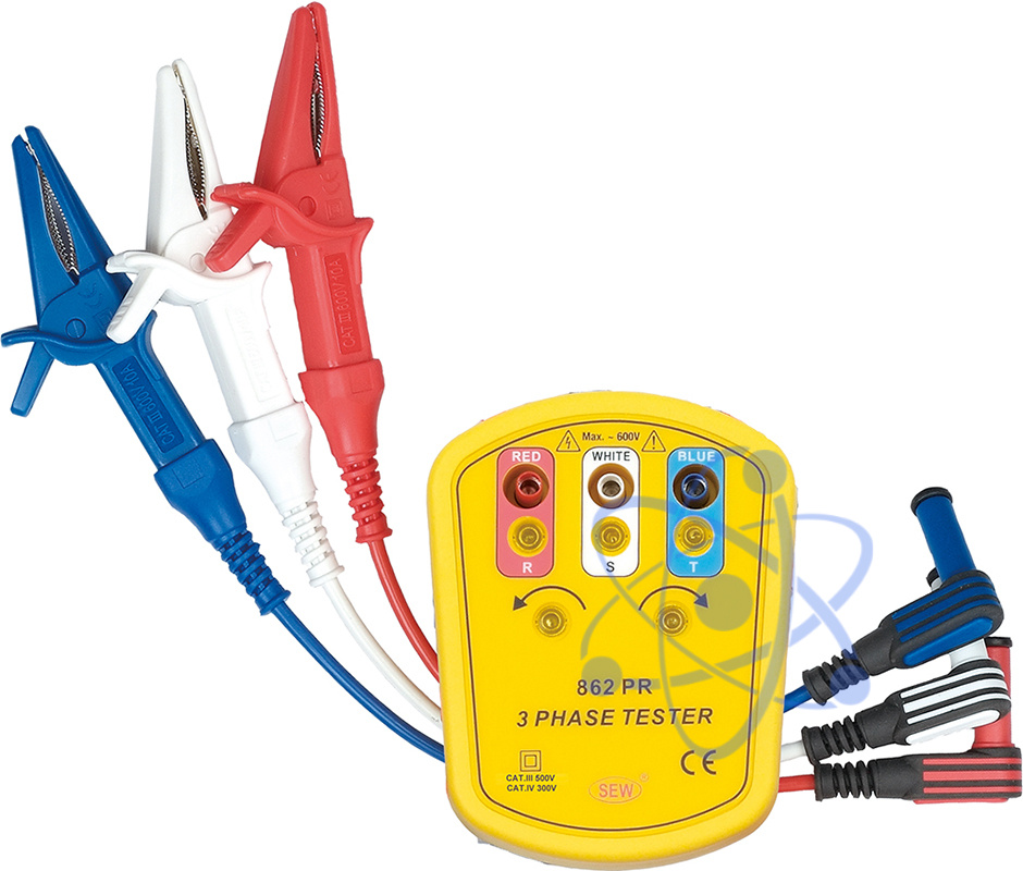 Измеритель порядка чередования фаз 862 PR: Определение наличия и порядка чередования фаз; Используется электронная схема индикации; Комплектуется удобными съемными проводами; Позволяют проводить измерения в 3-х фазных цепях в широком диапазоне напряжений от 100 В до 600 В; Идеально подходят для использования на конвейерных линиях, насосных станциях и в механизмах электроприводов; Обеспечена высокая степень электробезопасности; Влагозащитное и компактное исполнение, удобен и прост в эксплуатации; Изготовлен из высокопрочного пластика; Масса 115 г.