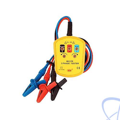 Измеритель порядка чередования фаз 863 PR: Определение наличия и порядка чередования фаз; Используется электронная схема индикации; Комплектуется удобными зажимами типа «крокодил», позволяющими легко подключаться к выводам различной конфигурации до 35 мм; Позволяют проводить измерения в 3-х фазных цепях в широком диапазоне напряжений от 100 В до 600 В; Идеально подходят для использования на конвейерных линиях, насосных станциях и в механизмах электроприводов; Обеспечена высокая степень электробезопасности; Влагозащитное и компактное исполнение, удобен и прост в эксплуатации; Изготовлен из высокопрочного пластика; Масса 115 г.