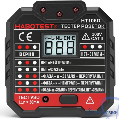 Тестер розеток и УЗО HT106D - прибор для проверки электрических розеток. Позволяет мгновенно определить правильность разводки питания на розетку и указать на характер ошибки разводки. Кнопка задания тока утечки заземления свыше 30 мА позволяет проверить правильность срабатывания УЗО.