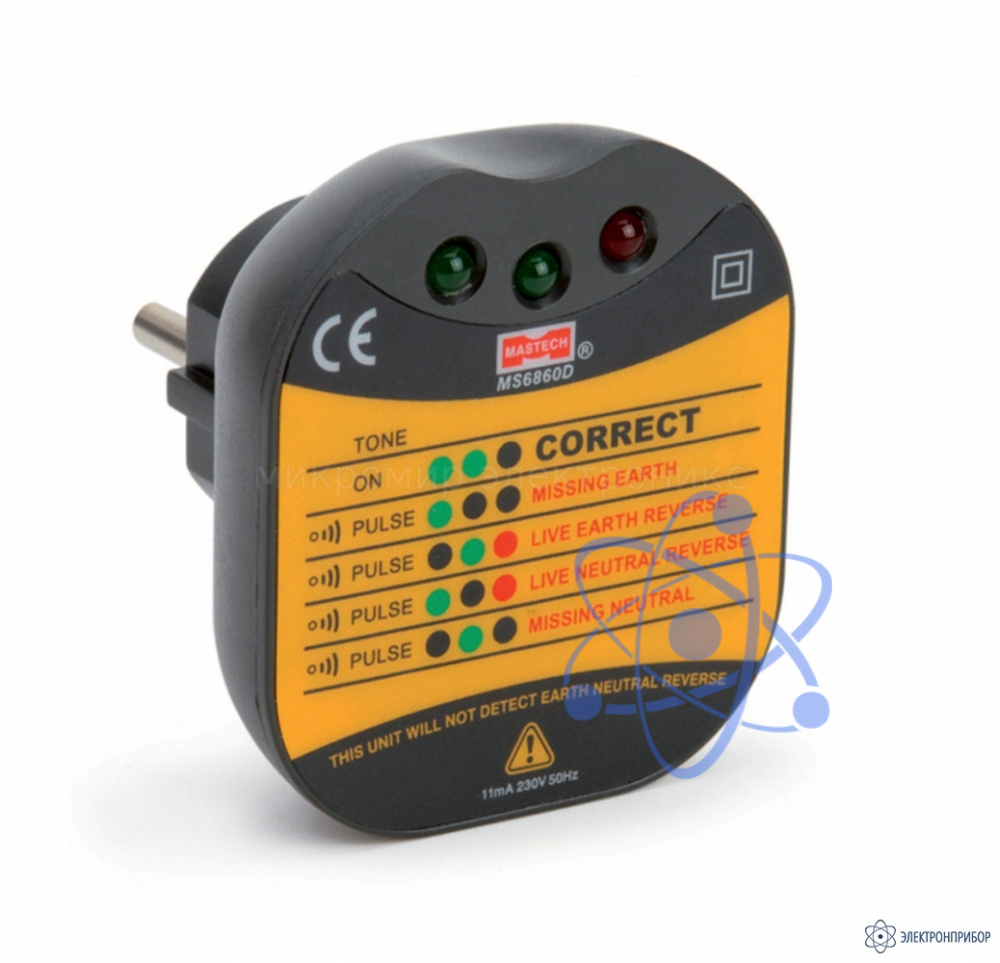 Тестер электрических розеток Mastech MS6860D предназначен для проверки правильности подключения контактов электрической розетки. Этот тестер определяет перепутанные местами и неподключенные контакты. Тестер рассчитан на напряжение 230В. Он снабжен звуковой и световой сигнализацией. При правильной разводке розетки горят два зеленых светодиода, и звучит непрерывный сигнал.