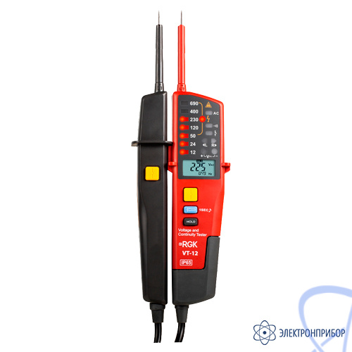 Измерения производятся почти мгновенно, результаты отображаются на дисплее крупным шрифтом и фиксируются с помощью кнопки HOLD для последующего анализа и документации. Электрический тестер RGK VT-12 автоматически подстраивается под ток нагрузки и сигнализирует о перегрузке. Режим тестирования УЗО активируется отдельно специальными кнопками на щупах. Светодиодные индикаторы указывают на уровень напряжения, полярность и вращение фазы.