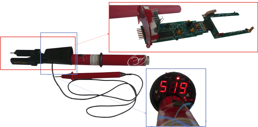 Отображение измеряемого значения и режима работы (постоянный, переменный, ток или напряжение) выполняется с помощью цифрового дисплея. Для определения значения постоянного и переменного тока в воздушных сетях и распределительных устройствах с напряжением 0,4-10 кВ индикатор оснащен изолирующей рукояткой со стержнем, длиной 0,52 м. В комплектации с изолирующим многофункциональным 4-сегментным сборным стержнем ШО-10-4-6,6 длиной 6,6 м, предоставляемым по запросу клиента за дополнительную стоимость, индикатор позволяет определить ток на линиях электропередач с напряжением 0,4-10 кВ непосредственно с земной поверхности, без необходимости взбираться на опору.