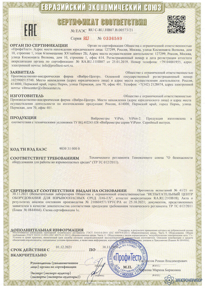 Рабочим, поверенным для прибора ViPen-2, является стандартный диапазон частот от 10 до 1000 Гц. На проведение измерений вибрации в этом диапазоне частот прибор имеет метрологический сертификат.