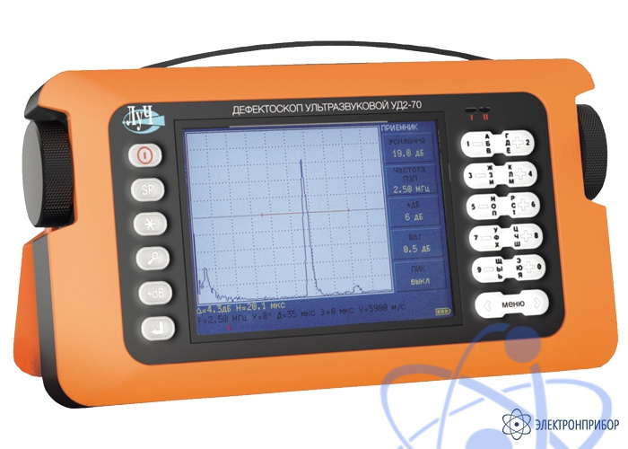 Ультразвуковой дефектоскоп УД2-70 предназначен для контроля продукции на наличие дефектов типа нарушения сплошности и однородности материалов, полуфабрикатов, готовых изделий и сварных соединений, для измерения глубины и координат их залегания, измерения отношений амплитуд сигналов от дефектов. Также имеются специальные меню, которые применяются для выявления дефектов в деталях и узлах локомотивов и МВПС и в деталях элементов колесных пар вагонов, в которых записаны типовые настройки прибора.