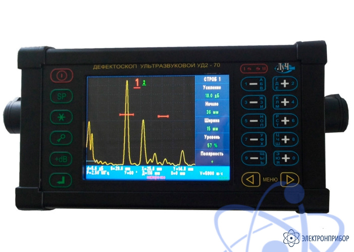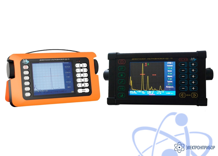 Дефектоскоп УД2-70 представляет собой электронный блок с подключенным посредством кабеля ультразвуковым преобразователем (УЗ ПЭП). Электронный блок может выпускаться в двух исполнениях: в жестком металлическом корпусе с ручкой для переноски и в пластиковом корпусе. На лицевой панели расположены многофункциональный цветной жидкокристаллический дисплей и маслобензостойкая пленочная клавиатура.