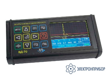 Дефектоскоп ВД-70 состоит из электронного блока и подключаемого к нему вихретокового преобразователя, который выбирают в зависимости от условий измерений. Возбуждение в контролируемом изделии вихревых токов осуществляется с помощью вихретокового преобразователя (ВТП). Изменения наведенного поля, обусловленные наличием дефекта в материале, регистрируются преобразователем. Полученный электрический сигнал преобразовывается в цифровую форму и выдается на дисплей. Принцип работы дефектоскопа основан на анализе взаимодействия внешнего электромагнитного поля с полем вихревых токов, возбуждаемых в объекте контроля.