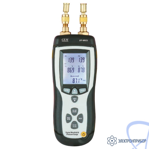 - Широкий дисплей с подсветкой отображает показания в любой комбинации: Р1, Р2, Р1-Р2, Т1,Т2, Т1-Т2, Ambient (температура окружающей среды), плюс максимальное, минимальное и среднее значения (MAX, MIN, AVG);