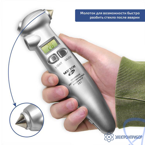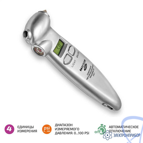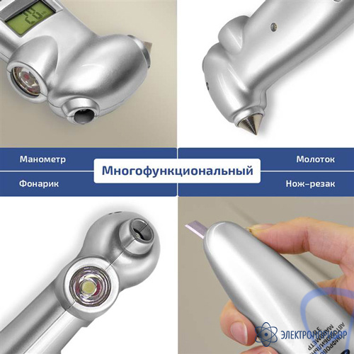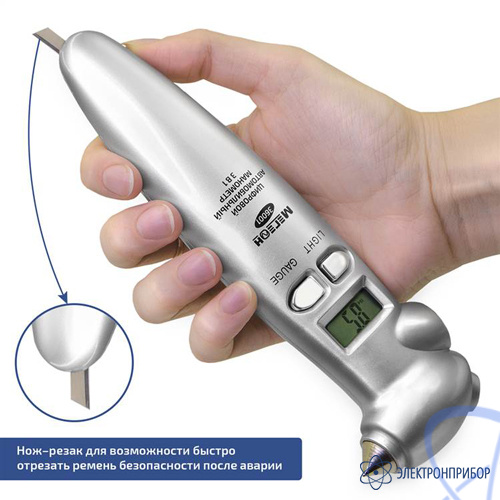 Цифровой автомобильный манометр МЕГЕОН 36001 является универсальным инструментом «3в1», предназначен для измерения давления в шинах транспортных средств. Изделие имеет удобную форму наконечника, что значительно упрощает выполнение измерений. Наличие подсветки дисплея и наконечника манометрапозволяет выполнять измерения в любое время суток. Встроенные в корпус молоток и резак для ремней безопасности позволят быстро покинуть салон автомобиля после аварии.