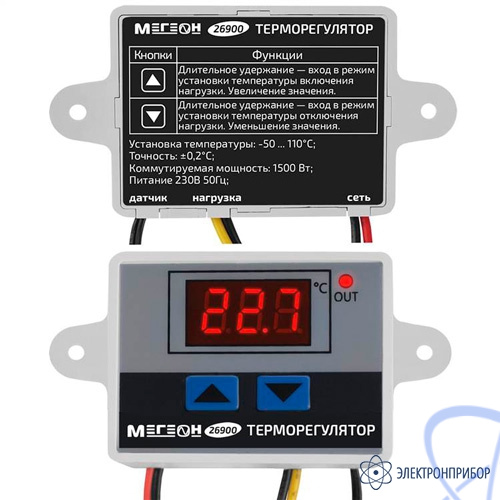 МЕГЕОН 26900 - электронный терморегулятор с выносным датчиком температуры предназначен для встраивания в автоматизированные системы управления. Устройство необходимо для осуществления подачи напряжения на нагреватель или охладитель в зависимости от предустановленных пределов. Таким образом изделие контролирует нагрев, охлаждение/ проветривание и в целом обеспечивает благоприятные условия в том помещении, где оно установлено. Зачастую установку осуществляют в местах где необходимо выдерживать температурный режим или влажность, например это может быть теплица (целые тепличные комплексы), террариум/ аквариум в домашних условиях или промышленное строение для выращивания грибов. Удобство эксплуатации обеспечивается тем, что питание осуществляется от сети переменного тока 230 В 50 Гц. Прибор успешно может применяться в единой экосистеме "умный дом". Станет незаменимым помощником по хозяйству, упростит уход за животными и растениями, снизит трудозатраты при обслуживании грибниц и будет поддерживать комфортную обстановку в квартире.
