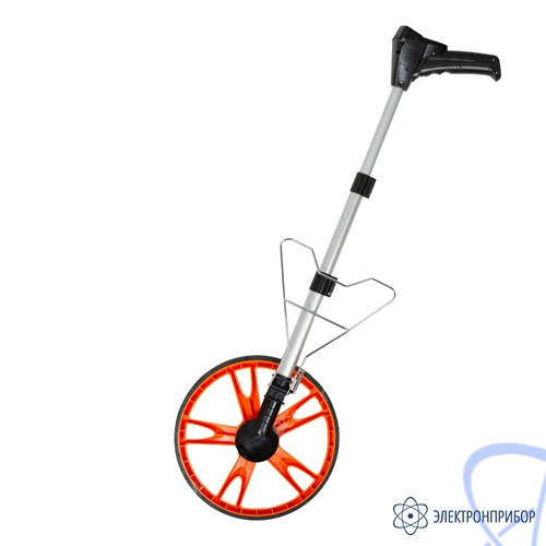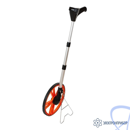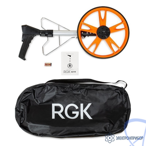 Удобство использования и транспортировки. Телескопическая рукоятка курвиметра RGK Q318, на которой крепится дорожное колесо, позволяет установить длину штанги в зависимости от роста специалиста. Складная конструкция обеспечивает удобную транспортировку прибора в автомобиле или в общественном транспорте. Специальная подножка, предназначенная для удержания дорожного колеса в вертикальном положении