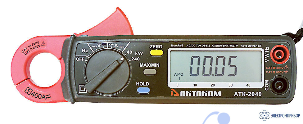 Токовые клещи-ваттметр АТК-2040: измерение постоянного (0,1 ... 400 А) и переменного (40 Гц ... 1 кГц) (0,1 ... 400 А) тока, постоянного и переменного (40 Гц ... 1 кГц) напряжения (0,1 ... 400 В), постоянной (0,01 ... 400 кВт) и переменной (0,01 ... 200 кВт) мощности, частоты (0,01 Гц ... 1000 кГц). True RMS. Фиксация min/max/hold. Диаметр захвата 23 мм. Базовая погрешность 1,5%. Графическая шкала. Питание 2х1,5 В. Поставляется в кейсе. Габариты 183х61,3х35,6 мм. Вес 190 г.