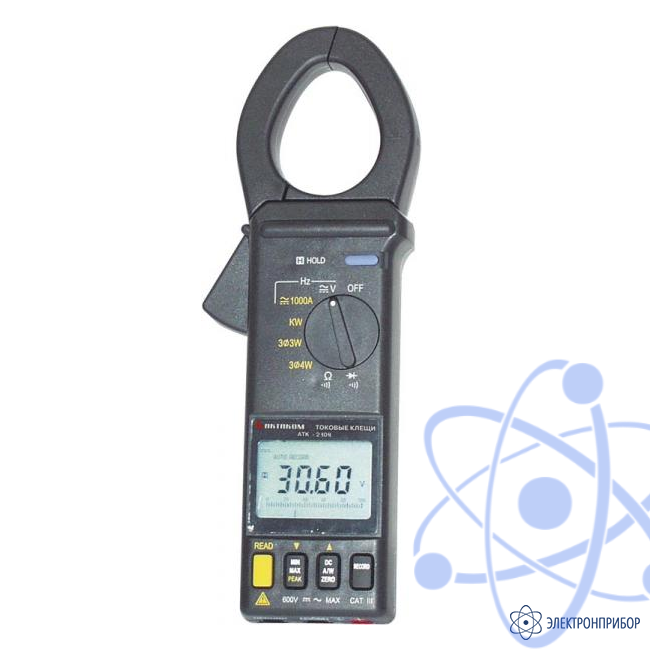 Профессиональная модель токовых клещей-ваттметра АТК-2104 с возможностью измерения параметров 3-фазных сетей. Имеет встроенный мультиметр, позволяет осуществлять регистрацию данных в ручном и автоматическом режиме, а также передавать данные в ПК через RS-232.