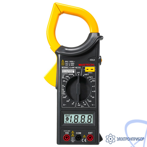 Отличительной особенностью токовых клещей Mastech M266C, является возможность измерения значения температуры окружающей среды в широком диапазоне (0 - 750 °C). В зависимости от положения дискового переключателя, измеренное значение температуры может индицироваться как °C, так и в °K. Модель Mastech M266C позволяет производить измерения переменного тока (20 - 400 А), сопротивления (0,2 - 2000 кОм), постоянного (0,2 - 1000 В) и переменного (200 - 750 В) напряжения и (при использовании специальной приставки - измерителя изоляции Mastech M261) сопротивление изоляции (20 - 2000 МОм). Большой (15 х 47 мм) 3 1/2-разрядный ЖК дисплей; Питание от одной батареи 9 В типа 1604 или 6F22 ("Крона"); Звуковой пробник; Проверка диодов; Раскрыв клещей 50 мм; Память HOLD; Масса 310 г.