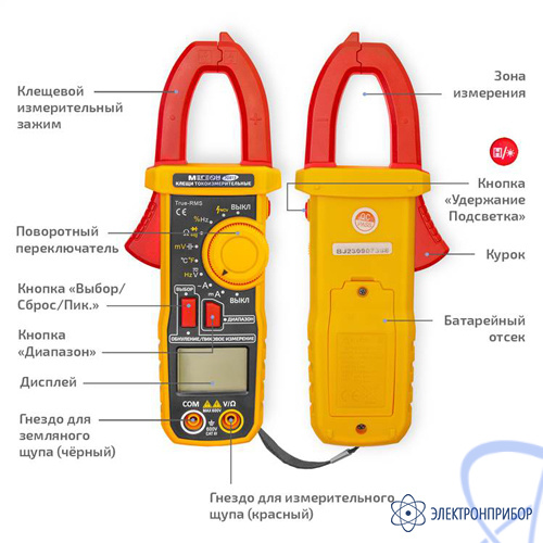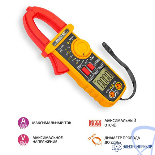 Токоизмерительные клещи МЕГЕОН 70813 предназначены в первую очередь для измерения переменного и постоянного тока бесконтактным способом, а в комбинации с мультиметром позволяют дополнительно измерять напряжение, частоту и скважность сигнала, ёмкость конденсатора, сопротивление, а также температуру при помощи входящей в комплект термопары. Прибор отображает действующее (среднеквадратичное) и пиковое значение, имеет встроенную защиту от перегрузки, функции ручного и автоматического выбора диапазона, диодного теста, звукового оповещения для проверки целостности цепи, бесконтактного детектора напряжения, определителя фазовой линии и спящего режима при бездействии для экономии заряда батареи. Измеритель выполнен в эргономичном корпусе и удобен для управления одной рукой, оснащён контрастным жидкокристаллическим дисплеем, питается от двух батареек 1,5 В (тип ААА), укомплектован чехлом для хранения и переноски.