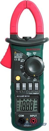 Токоизмерительные клещи MS2008A имеют автоматический выбор пределов измерений и позволяют измерять силу переменного тока, значения постоянного и переменного напряжения и сопротивления.