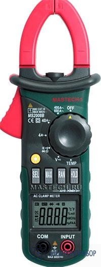 Токоизмерительные клещи MS2008B имеют автоматический выбор пределов измерений и позволяют измерять силу переменного тока, ёмкость, температуру окружающей среды, частоту и скважность импульсов.