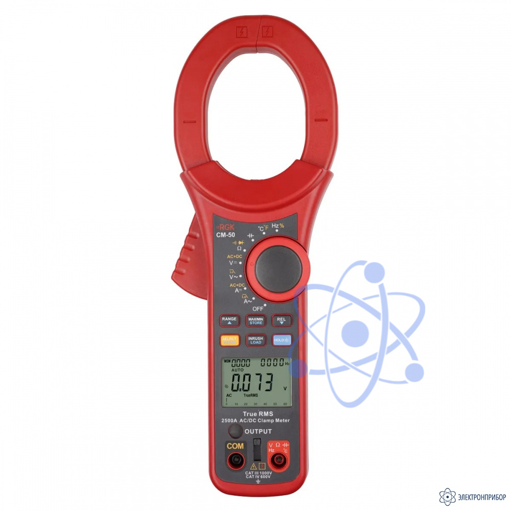 Клещи токоизмерительные RGK CM-50 - профессиональный прибор для замеров силы тока до 2500A бесконтактным методом. Инструмент автоматически выбирает рабочий диапазон и определяет тип тока - постоянный или переменный, что позволяет работать более эффективно, без лишних затрат времени на настройку.