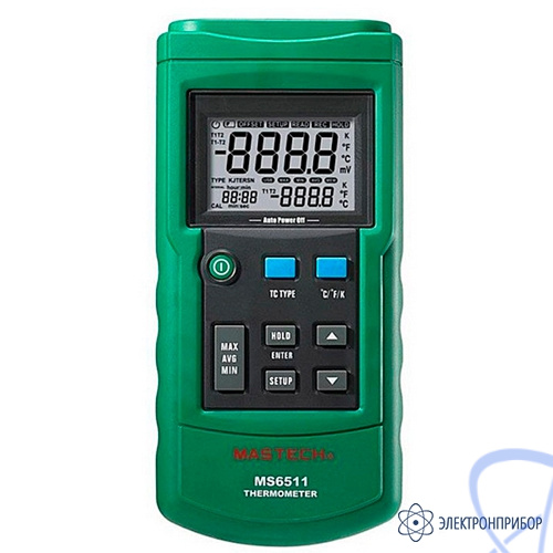 Цифровой термометр MS6511 предназначен для измерения температуры окружающей среды или предметов. Оснащен термопарой типа К, подсоединяемой через разъем в верхней части корпуса. Подходит для различных термопар, таких как J, K, T, E. Может отображать результаты в °C, °F и K. Имеет функцию измерения максимального, минимального и среднего значения.