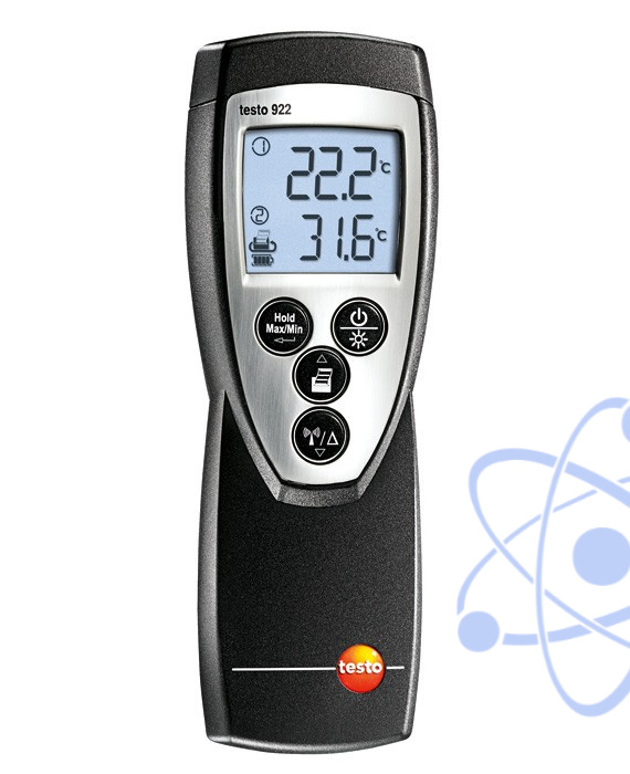 Дифференциальный термометр фиксирует температурные значения двух подсоединенных зондов термопар и отображает их одновременно. Данные с дополнительного температурного зонда могут также передаваться на дисплей testo 922. Дифференциальная температура может быть вычислена нажатием одной кнопки. Данные текущих измерений также как и макс/мин значения могут быть распечатаны на месте замера на портативном Testo принтере. Также с помощью функции циклической печати данные могут распечатываться, например, 1 раз в минуту. Модель внесена в Государственный Реестр Средств измерений РФ.