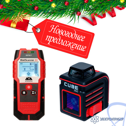 Новогодний комплект (артикул А00728) состоит из построителя лазерных плоскостей ADA CUBE 360 Basic Edition и детектора проводки ADA Wall Scanner 80.