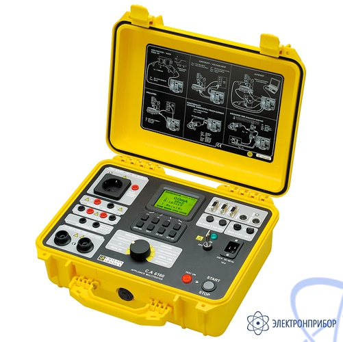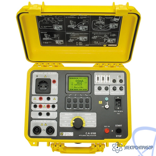 Прибор для проверки электрических машин CA6160 является переносной многофункциональной высоковольтной установкой для проведения ряда испытаний различного оборудования, портативных электроприборов, распределительных электрощитов и другое. Прибор CA6160 может быть подключен к ПК для программирования процедуры измерения и задания последовательности измерений для проведения автоматического испытания. CA6160 встроен в удобный для переноски корпус, выполненный в виде чемодана.