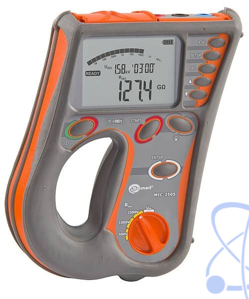 MIC-2505 — цифровой мегомметр, предназначенный для измерения сопротивления изоляции кабельных линий, проводов, обмоток трансформаторов, двигателей, других электро- и телекоммуникационных установок. Максимальное измерительное напряжение составляет 2500 В постоянного тока (три стандартных значения — 500 В, 1000 В и 2500 В), а диапазон измеряемого сопротивления ограничен величиной в 2000 ГОм. Автоматический расчет коэффициентов абсорбции (увлажненности) и поляризации (старения). В процессе измерения сопротивления изоляции прибор отображает величину тока утечки.