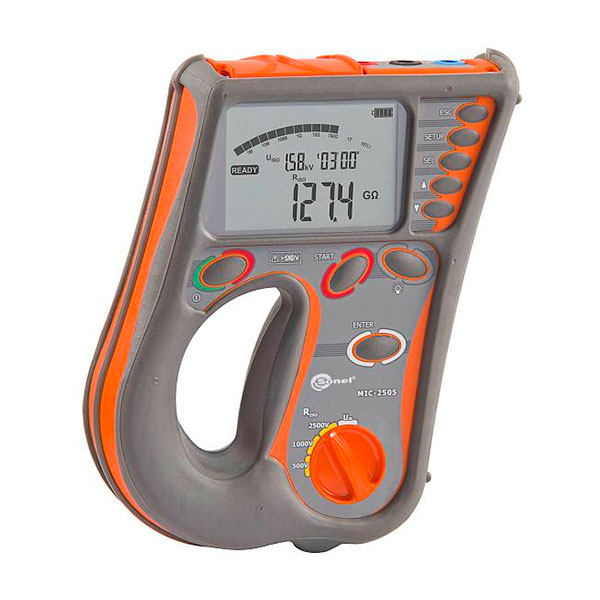 MIC-2510 — цифровой мегомметр, предназначенный для измерения сопротивления изоляции кабельных линий, проводов, обмоток трансформаторов, двигателей, других электро- и телекоммуникационных установок. Максимальное измерительное напряжение составляет 2500 В постоянного тока, а диапазон измеряемого сопротивления ограничен величиной в 2000 ГОм. Установка трех интервалов времени позволяет автоматически рассчитывать коэффициент абсорбции (увлажненности) и поляризации (старения). В процессе измерения сопротивления изоляции прибор отображает величину тока утечки, а также измеряет емкость кабеля.