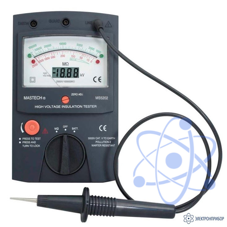 Цифровой мегоомметр MS5202 служит для измерения сопротивления изоляции токонесущих элементов электросетей, находящихся под большим напряжением. MS5202 полностью соответствует требованиям международного стандарта IEC1010-1 CAT II 5000V. MS5202 имеет большой стрелочный индикатор с зеркальной шкалой, которая служит для повышения точности измерений и цифровой дисплей, служащий для индикации выходного напряжения.