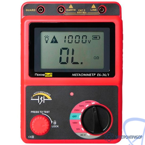 Мегаомметр ПрофКиП Е6-36/1 измеряет сопротивление изоляции в диапазоне от 0 Ом до 20 ГОм. Измеритель сопротивления изоляции позволяет производить измерение напряжением от 50 В до 1000 В, которое разбито на 5 фиксированных режимов. Помимо сопротивления, прибор позволяет измерять напряжение электрической цепи. Тестер изоляции ПрофКиП Е6-36/1 при измерении выводит показания на ЖК-дисплей, оснащенный подсветкой.