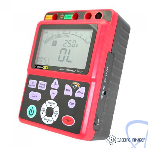 Мегаомметр цифровой ПрофКиП Е6-37 является одним из лучших в своей ценовой категории прибором. Мегаомметр ПрофКиП Е6-37 позволяет производить измерения сопротивления изоляции проводки и различных электротехнических устройств, источников питания, трансформаторов и генераторов. Измеритель сопротивления изоляции может использоваться в мастерских по ремонту электрических устройств. Мегаомметр ПрофКиП Е6-37 производит измерение сопротивления в пределах от 0 до 1000 ГОм, используя для этой цели 5 режимов с номинальным напряжением 250 В /500 В /1000 В /2500 В /5000 В. Измеритель сопротивления изоляции имеет возможность калибровки.