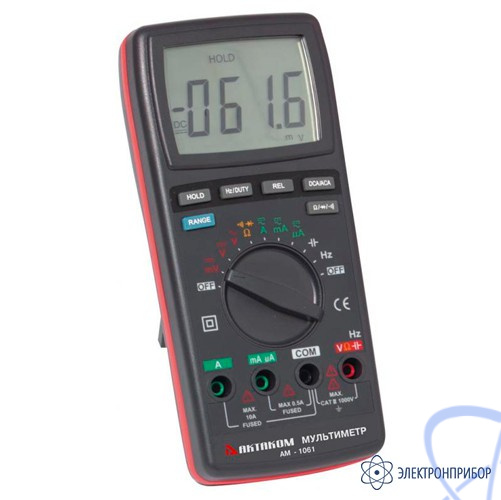 Цифровой мультиметр АМ-1061 выполнен в корпусе из ударопрочного полистирола. Высота цифр на ЖКИ у мультиметра АМ-1061 23 мм! Для быстрого измерения параметров переменного напряжения в нем предусмотрено измерение частоты и коэффициента заполнения импульсного сигнала. При измерение переменного напряжения и тока отображаются истинные среднеквадратичные значения (TrueRMS).