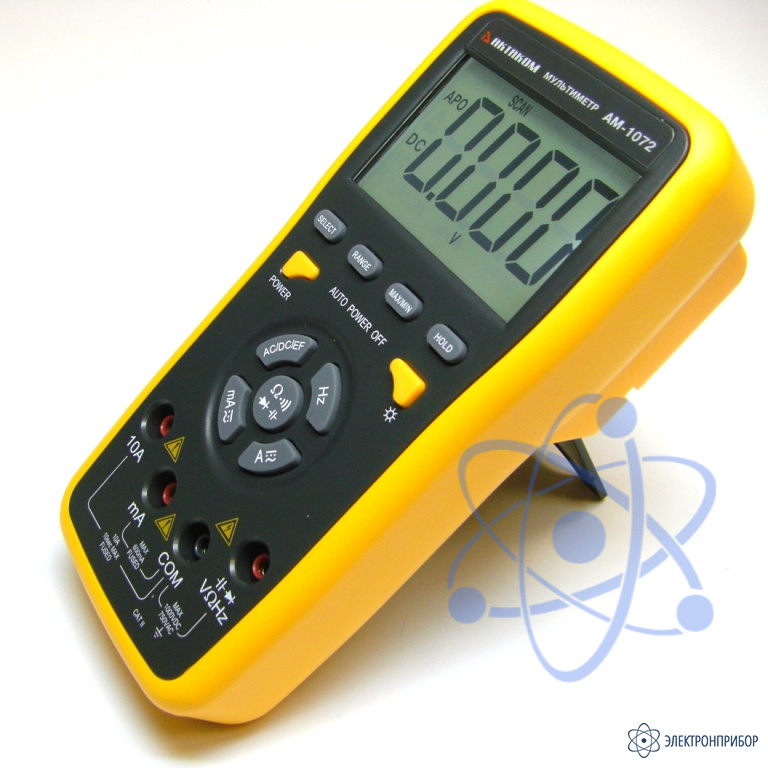 Мультиметр АМ-1072 предназначен для измерения постоянного и переменного тока и напряжения, сопротивления, ёмкости (до 60 мФ) частоты, проверки диодов и прозвонки электрических цепей.