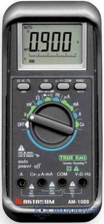 Мультиметр АМ-1089: True RMS; измерение в частотном диапазоне 45 Гц ... 2 кГц: постоянного напряжения 100 мкВ ... 1000 В, переменного напряжения 100 мкВ ... 750 В, постоянного тока 1 мкА ... 10 А, переменного тока 1 мкА ... 10 А, сопротивления 100 мОм ... 50 МОм, емкости 1 пФ; 50 мФ, частоты 0,01 Гц; 10 МГц, P-N Тест, прозвонка цепи; базовая погрешность 0,1%; дополнительные функции: ЖКИ 3 3/4, аналоговая шкала, удержание показаний, относительные измерения, фиксация минимального и максимального значений, автоотключение, защита, автоматическое и ручное переключение диапазонов; питание 9 В, габариты 192х90х37 мм, масса 0,76 кг.