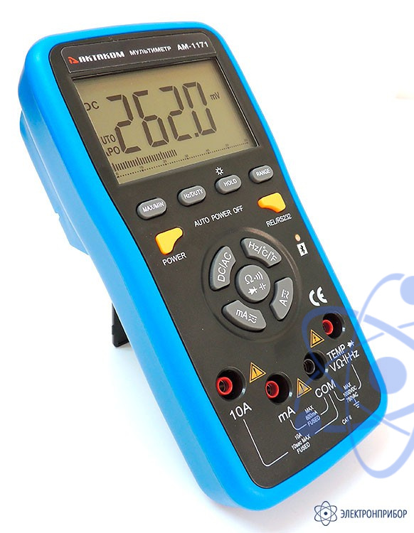 Мультиметр AM-1171 предназначен для измерения постоянного и переменного тока и напряжения, сопротивления, ёмкости, частоты, проверки диодов и прозвонки электрических цепей. Модель АМ-1171 предусматривает возможность измерения температуры и подключения к ПК через USB-интерфейс. Программное обеспечение Aktakom DMM Light реализует, отображение текущего значения и истории измерений в виде таблицы и графика с определением максимального, минимального и среднего значений, обработки и сохранения в файлы данных на ПК.