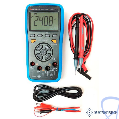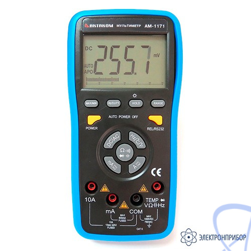 Мультиметр AM-1171 предназначен для измерения постоянного и переменного тока и напряжения, сопротивления, ёмкости, частоты, проверки диодов и прозвонки электрических цепей. Модель АМ-1171 предусматривает возможность измерения температуры и подключения к ПК через USB-интерфейс. Программное обеспечение Aktakom DMM Light реализует, отображение текущего значения и истории измерений в виде таблицы и графика с определением максимального, минимального и среднего значений, обработки и сохранения в файлы данных на ПК.