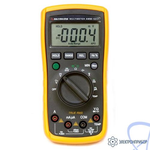Мультиметр AMМ-1017 предназначен для измерения постоянного и среднеквадратического значения переменного тока и напряжения, сопротивления, ёмкости, температуры, проверки диодов и прозвонки электрических цепей.